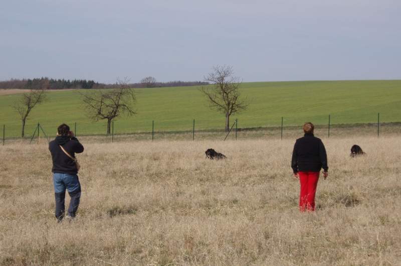 Horní louka skýtala ideální prostor pro výcvik, a tak se mohl rekordní počet pejsků (objevilo se jich na ranči na 20) zapojit do výcviku pod vedením zkušeného dua Čermáková - Šimek. Začátečníci s Petrem a pokročilí s Věrou se ve dvou skupinkách jali ukazovat jaké pokroky učinili přes zimu. Světe div se, přes veškeré pasivní prognózy se ukázalo, že pes Novofundladský, je plemeno, které nezapomíná, a proto cvičení dopadlo nad očekávání dobře.Bohoušku, stojí Ti obráceně! Nováčci získali první zkušenosti, pán od Domažlic, dle tradice, dělal to co viděl u ostatních, ve zkušenější skupince Gerda přinesla pískacího pejska na povel „Aport“, Gachona neutekla a Bohoušek trpělivě zkoušel co bolavá noha vydrží. Slunce svítilo a všem vyhládlo, Poslušné sestry v trávěšlo se tedy na oběd.